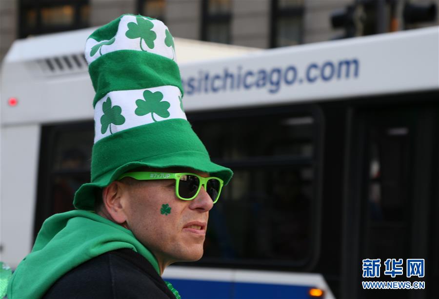 3月16日,在美国芝加哥,一名身穿绿色服饰的男子参加圣帕特里克节庆祝活动。 当日,芝加哥市民和游客聚集在芝加哥河两岸,观看染绿河水的活动。每年3月17日的圣帕特里克节是爱尔兰传统节日,为纪念爱尔兰守护神圣帕特里克而设立。 新华社记者王强摄
