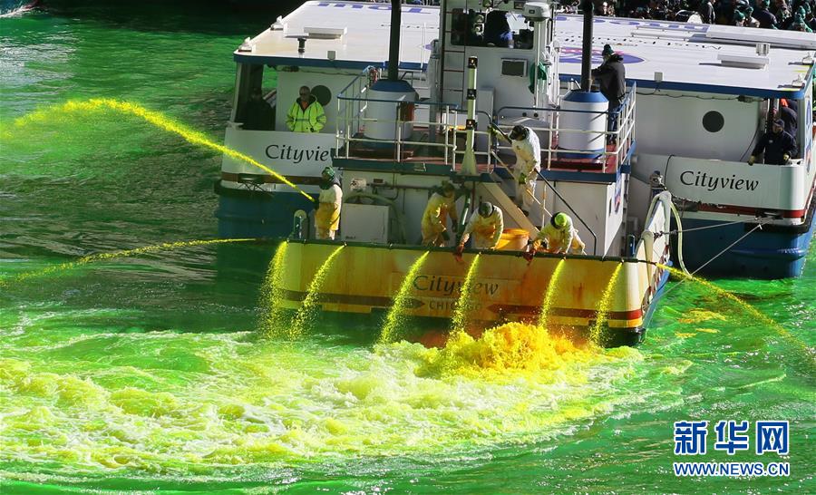 3月16日,在美国芝加哥,工作人员染绿芝加哥河,庆祝圣帕特里克节。 当日,芝加哥市民和游客聚集在芝加哥河两岸,观看染绿河水的活动。每年3月17日的圣帕特里克节是爱尔兰传统节日,为纪念爱尔兰守护神圣帕特里克而设立。 新华社记者王强摄