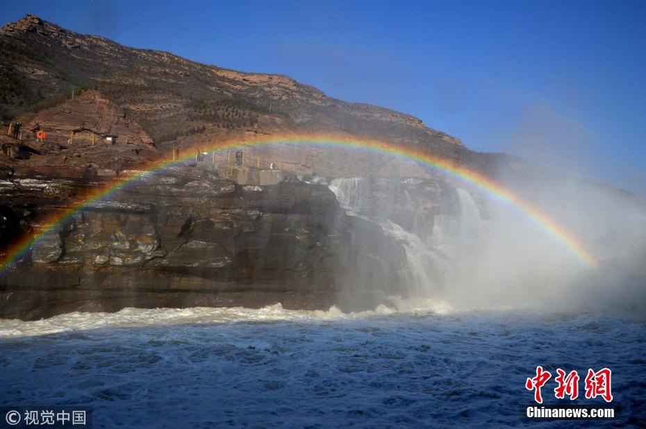 3月16日,山西省临汾市,游客在山西吉县黄河壶口瀑布欣赏彩虹美景。早春的壶口瀑布,天气晴朗,彩虹高挂,水浪飞溅,气势磅礴,吸引众多游客前来观赏。吕桂明 摄 图片来源:视觉中国