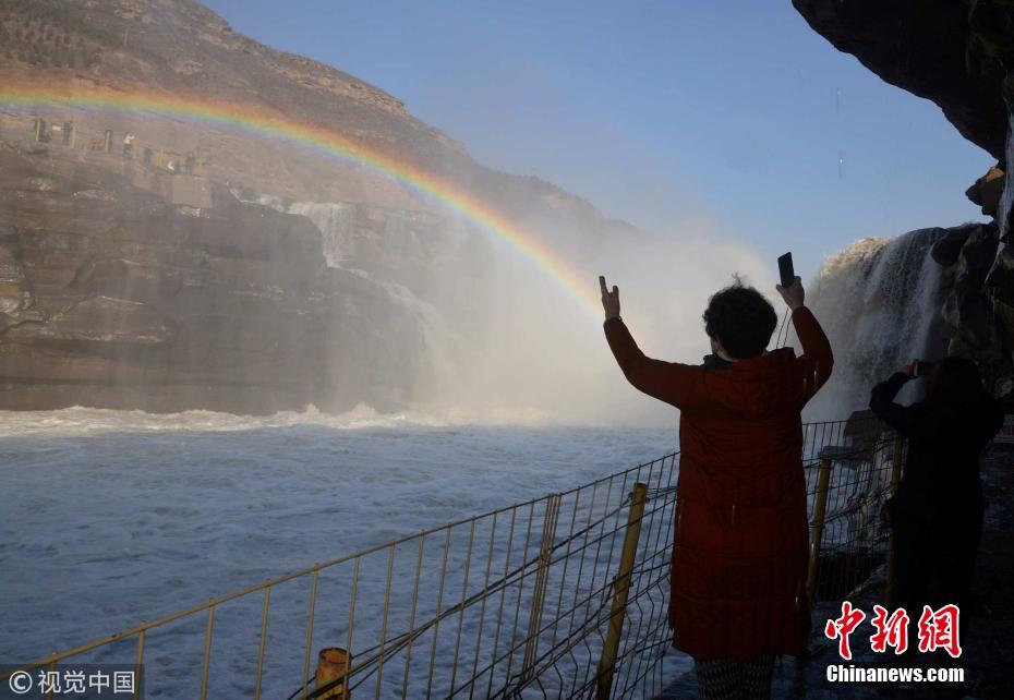 3月16日,山西省临汾市,游客在山西吉县黄河壶口瀑布欣赏彩虹美景。早春的壶口瀑布,天气晴朗,彩虹高挂,水浪飞溅,气势磅礴,吸引众多游客前来观赏。吕桂明 摄 图片来源:视觉中国