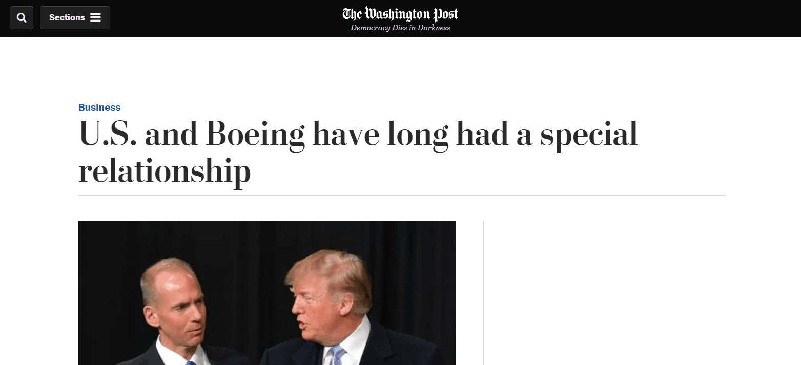 《华盛顿邮报》在16日的报道中称,在美国公司之间的竞争中,政府通常会保持中立。但波音是个例外,因为波音公司雇佣了成千上万的美国人,而它的主要竞争对手——空客公司(Airbus),则是在欧洲。