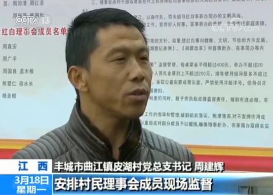江西省丰城市曲江镇皮湖村党总支书记 周建辉:我们尊重事主意愿的基础上召开村民大会,统一婚车的数量、酒席的价格,安排村民理事会成员现场监督,及时登记并公示,杜绝大操大办。