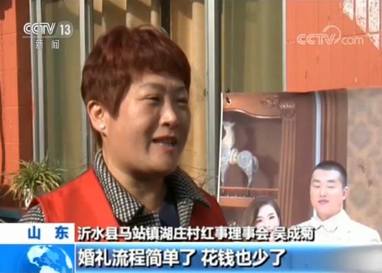 沂水县马站镇湖庄村红理事会成员 吴成菊:以前村里办个喜事很繁琐,花费也大,现在推行喜事新办以后,婚礼流程简单了,花钱也少了,年轻人对这件事情也非常认可。