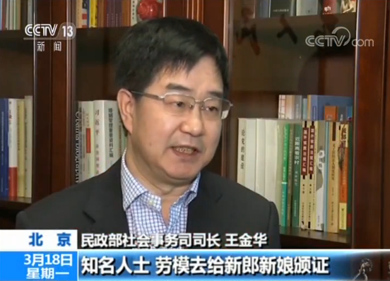 民政部社会事务司司长 王金华:下一步我们想把颁证仪式搞得更有意义,更富有人情味。婚姻登记机关可以邀请一些知名人士、劳模去给新郎新娘颁证,同时可以邀请新郎新娘双方父母、亲朋好友同时来参加颁证仪式,见证他们的百年之好,使颁证(仪式)有庄重感仪式感。
