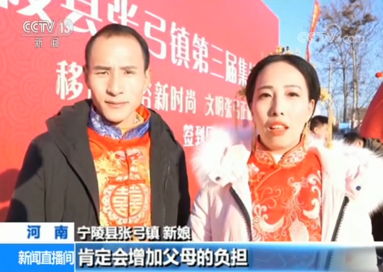 春节期间,河南省宁陵县张弓镇趁着在外创业青年返乡完婚的高峰期,在脱贫村小吕集,为十对新人举办了乡村集体婚礼,新郎李顺亚家原本是贫困户,今年刚刚脱贫,如果按照过去的习俗至少要花十几万的彩礼,一场婚礼就会让这个刚刚脱贫的家庭“因婚返贫”。结婚前,新娘主动劝父母放弃向新郎家索要彩礼。