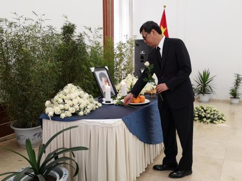 谈大使夫妇逐一迎接每位罹难者的亲属、所属单位领导及同事。在哀乐声中,谈大使夫妇陪同罹难者的亲属、所属单位领导及同事缓步至罹难者遗像前,肃立默哀、向遗像三鞠躬并敬献鲜花,表达哀思和怀念。