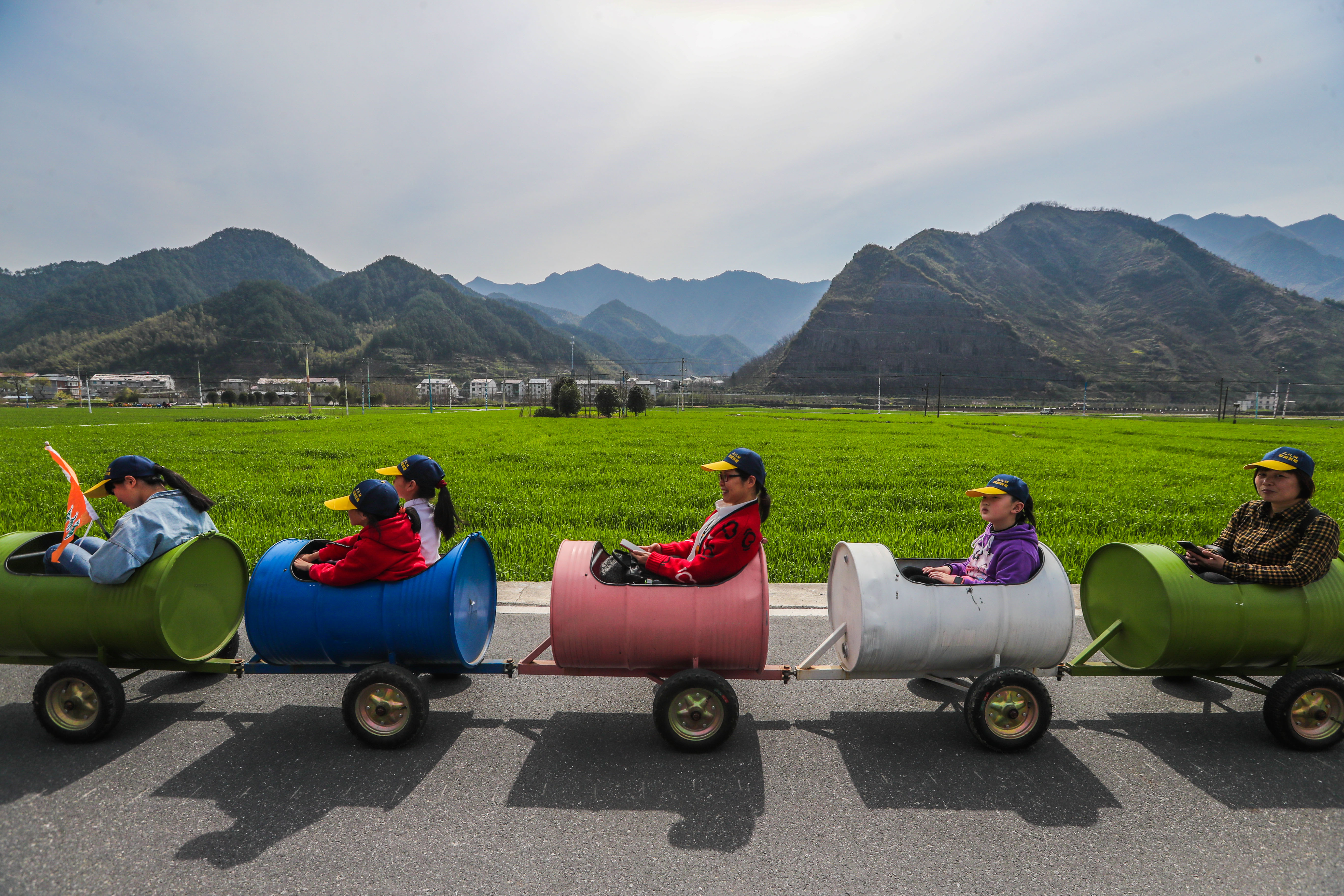 3月17日,游客在清凉峰镇杨溪村内乘坐特色游览车观赏春日美景。