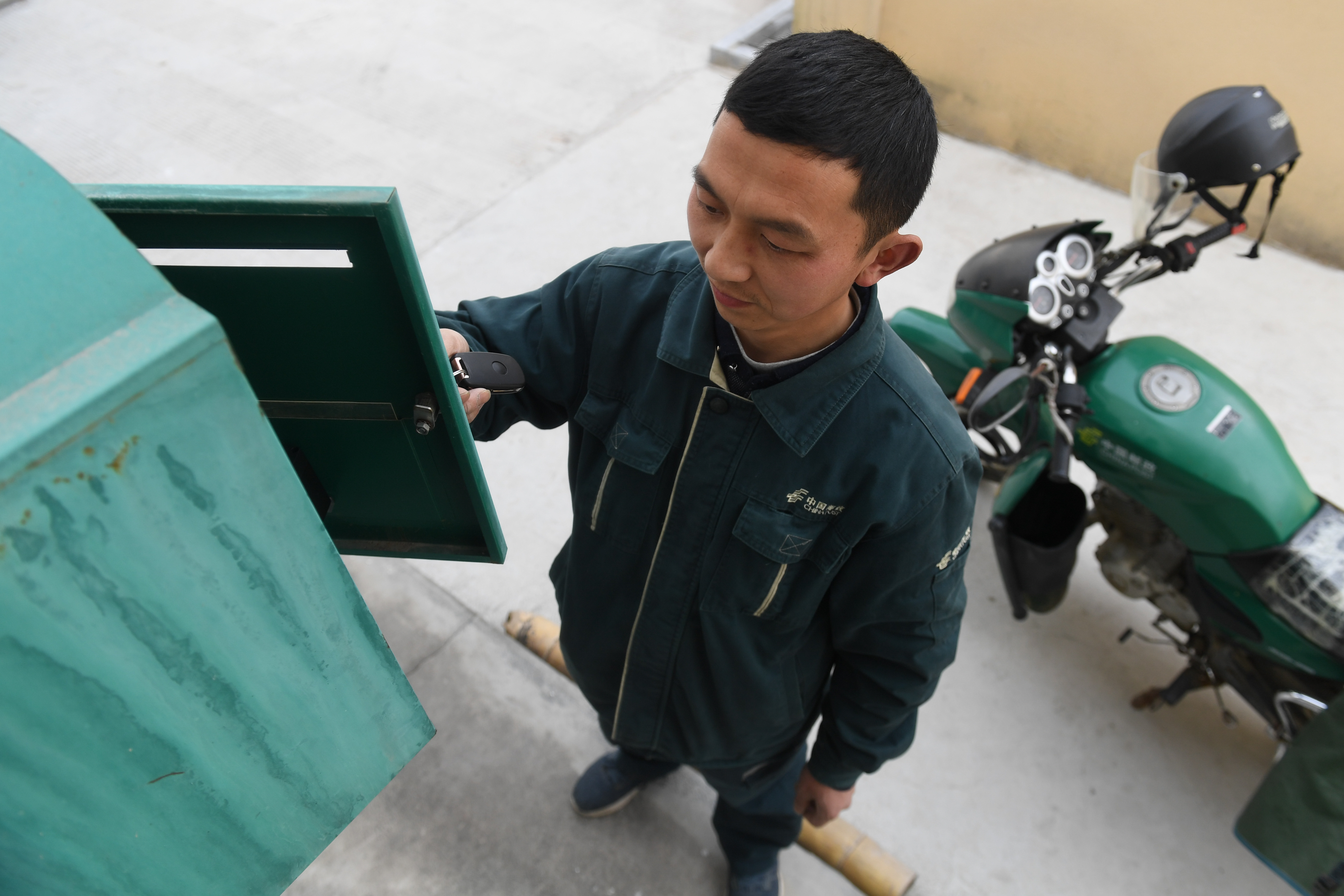 在岳西县和平乡,储选明打开信箱准备取出村民邮寄的信件(3月15日摄)。