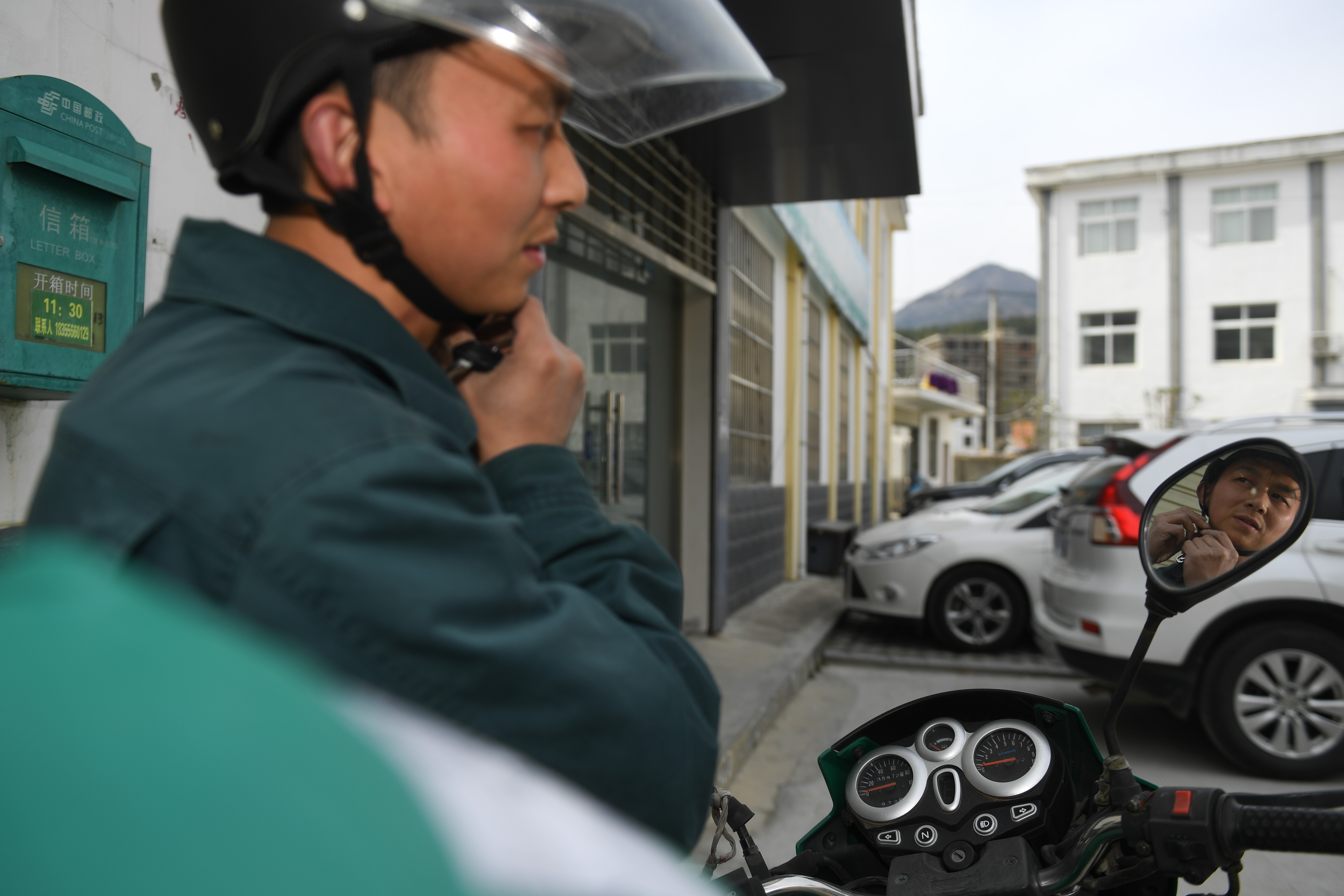 在岳西县和平乡,储选明准备骑摩托车投递邮件(3月15日摄)。