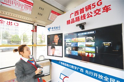 3月15日,在南宁的5G公交体验车上,屏幕上同时打开了16个高清视频,全程信号稳定不卡顿。张 颢摄(人民视觉)