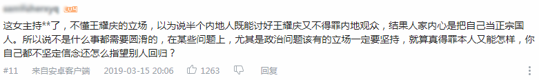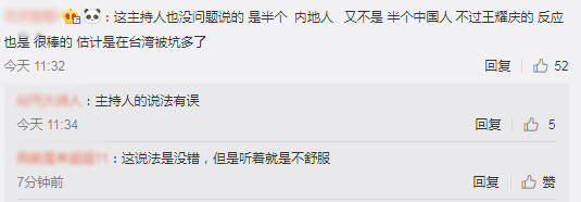也有网友分析主持人的说法,称(主持人)不懂王耀庆的立场,以为说半个内地人既能讨好王耀庆又不得罪内地观众,“结果人家内心是把自己当正宗国人”。