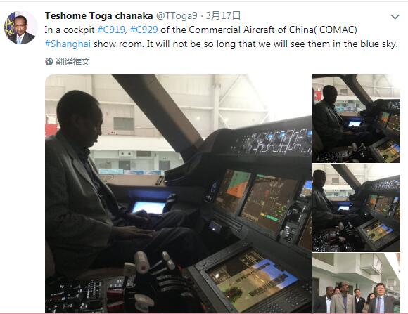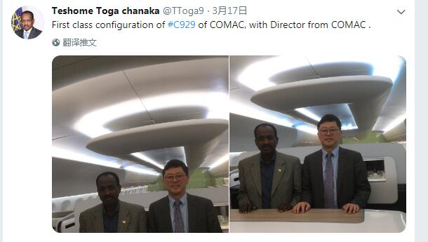 3月17日,推特账户@Teshome Toga chanaka发布了埃塞俄比亚驻华大使特肖梅·托加(Teshome Toga)访问中国商飞上海陈列室,参观C929驾驶舱、头等舱模型的照片。