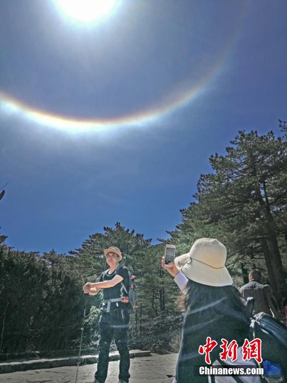 许多游客在日晕下拍照留念。 李金刚 摄