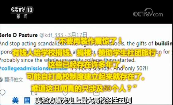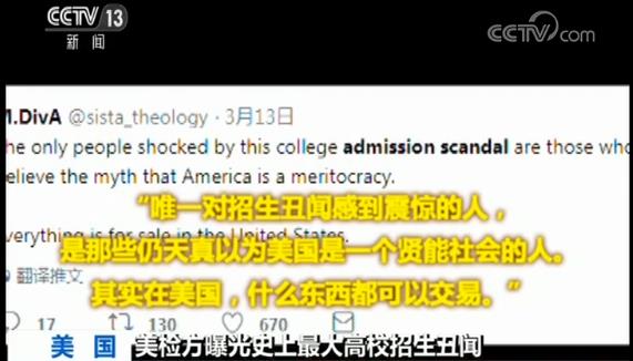 央视网消息 高校招生舞弊案持续发酵,在美国社交媒体上引发广泛讨论。而有一些美国网友表示,他们对此其实并不感到吃惊,可能还有更大的丑闻还没有被曝出来。