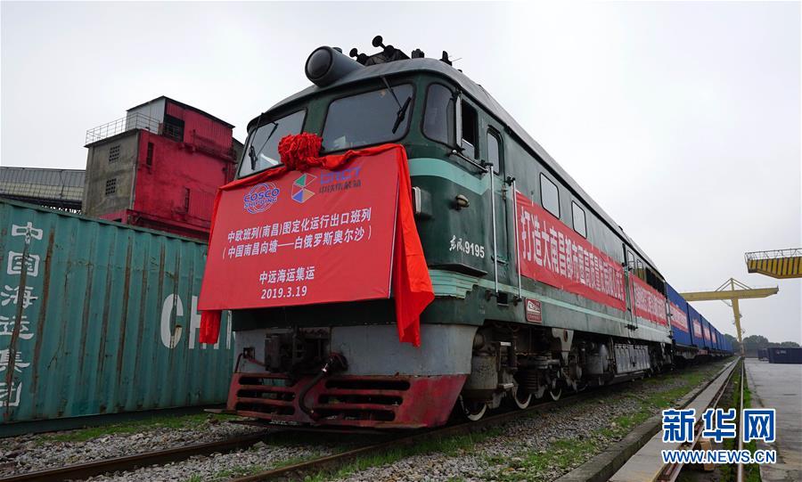 这是在南昌(向塘)铁路口岸拍摄的从南昌发往白俄罗斯的中欧班列(3月19日摄)。当日,中欧班列(南昌)图定化运行暨中国国际进口博览会“江西号”到发双向对开仪式在南昌(向塘)铁路口岸举行。满载着41车天然有机矿物培养原料和先进农用品的返程中欧班列(白俄罗斯至南昌),历经16天铁路运输,经由二连浩特入境抵达南昌(向塘)铁路口岸;同时,满载着46车服装、衣帽、电器等货物的南昌至白俄罗斯中欧班列将由二连浩特出境,行驶16天到达白俄罗斯明斯克站。两趟班列相继发出,标志着中欧班列(南昌-白俄罗斯)实现双向对发,这也是江西首条“点对点”中欧双向班列。新华社记者 彭昭之 摄