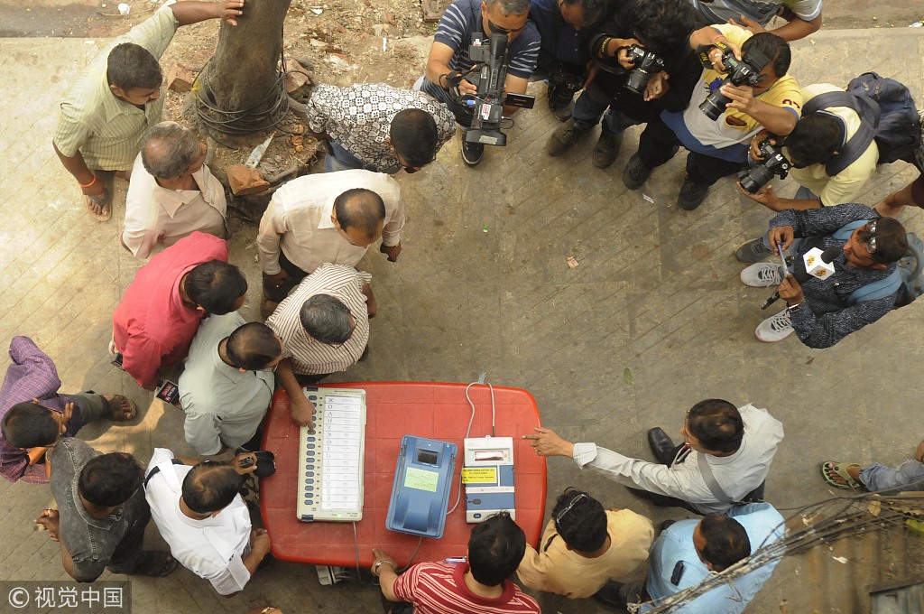 当地时间2019年3月19日,印度加尔各答,当地官员向民众展示电子投票机等投票工具。印度大选将于2019年4月11日至2019年5月19日举行。