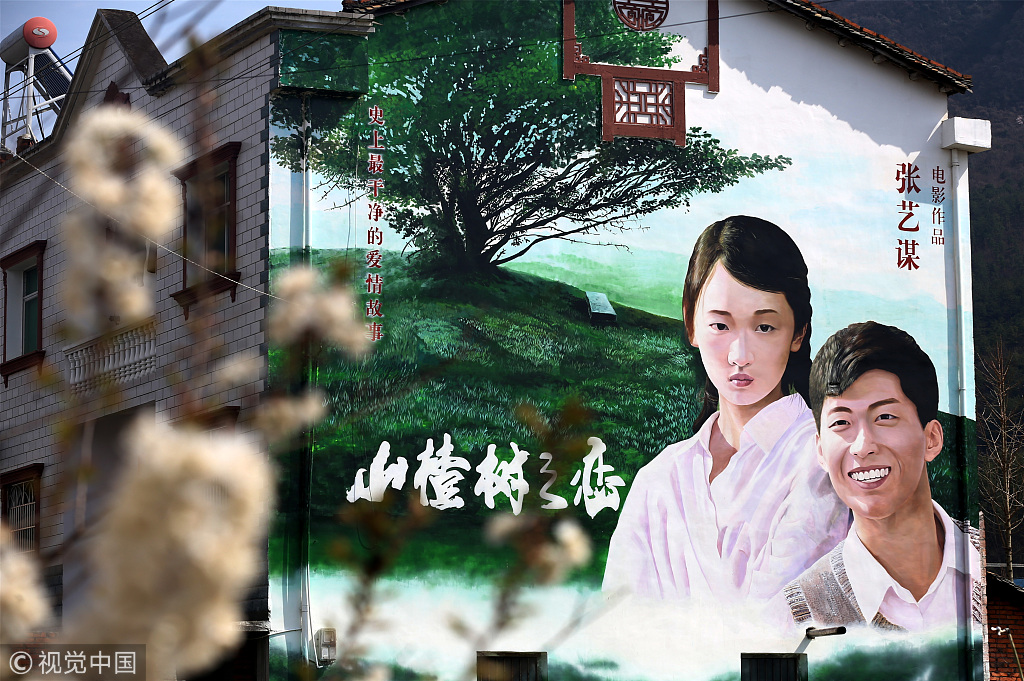 2019年3月15日,湖北省宜昌市夷陵区分乡镇普溪河村农房墙绘的电影《山楂树之恋》海报。