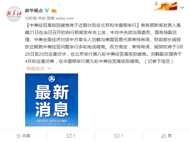 31520994,.中美经贸高级别磋商将于近期分别在北京和华盛顿举行,.2019-03-21 16:33:53,.204410,.孙熙越