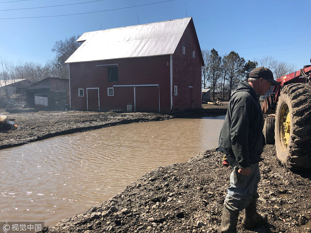 当地时间2019年3月20日,美国内布拉斯加州奥马哈市,当地农场被洪水淹没。