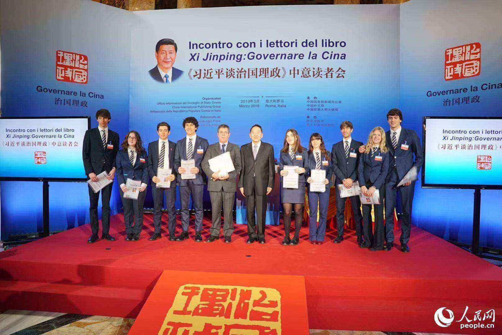 读者会上,蒋建国宣读了习近平主席给意大利罗马国立住读学校校长雷亚莱和8名高中学生的回信,并向他们赠送了习近平亲笔签名的《习近平谈治国理政》第二卷中文版图书。