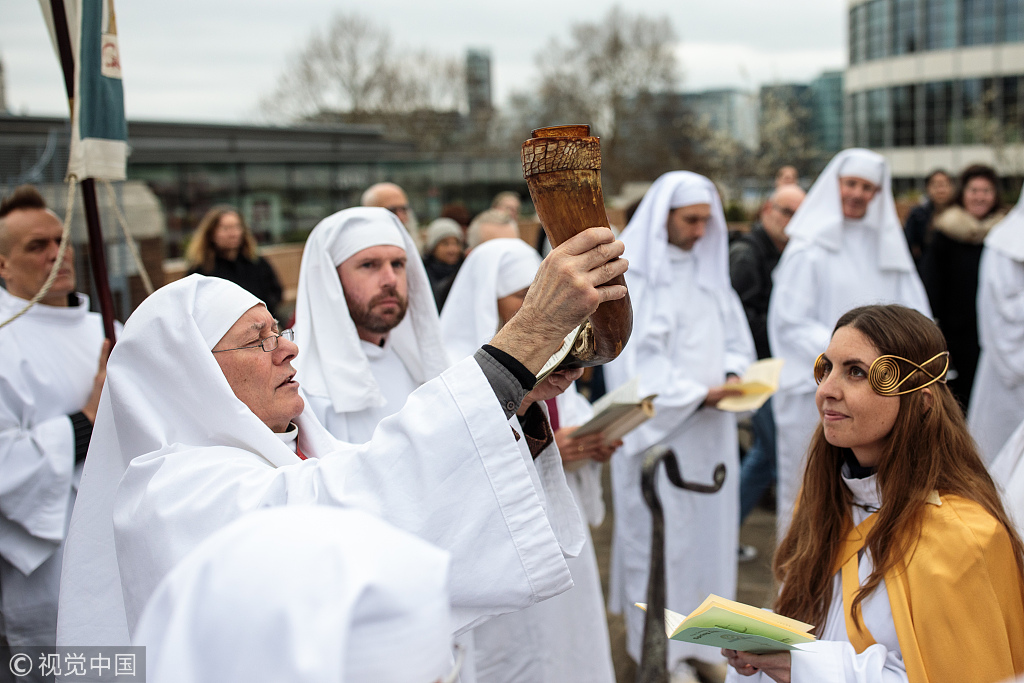 当地时间2019年3月20日,英国伦敦,德鲁伊教成员在塔山(Tower Hill)举行传统仪式,迎接春分日,这一仪式可追溯至1717年。