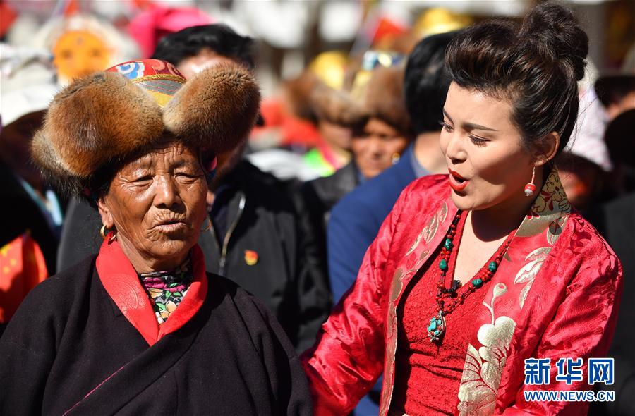 克松社区村民央金(左)和歌手合唱《我和我的祖国》(3月20日摄)。 1959年,克松是西藏第一个进行民主改革的村子,因此被称为西藏民主改革第一村。 2018年克松社区人均可支配收入达到19735元。 新华社记者 觉果 摄