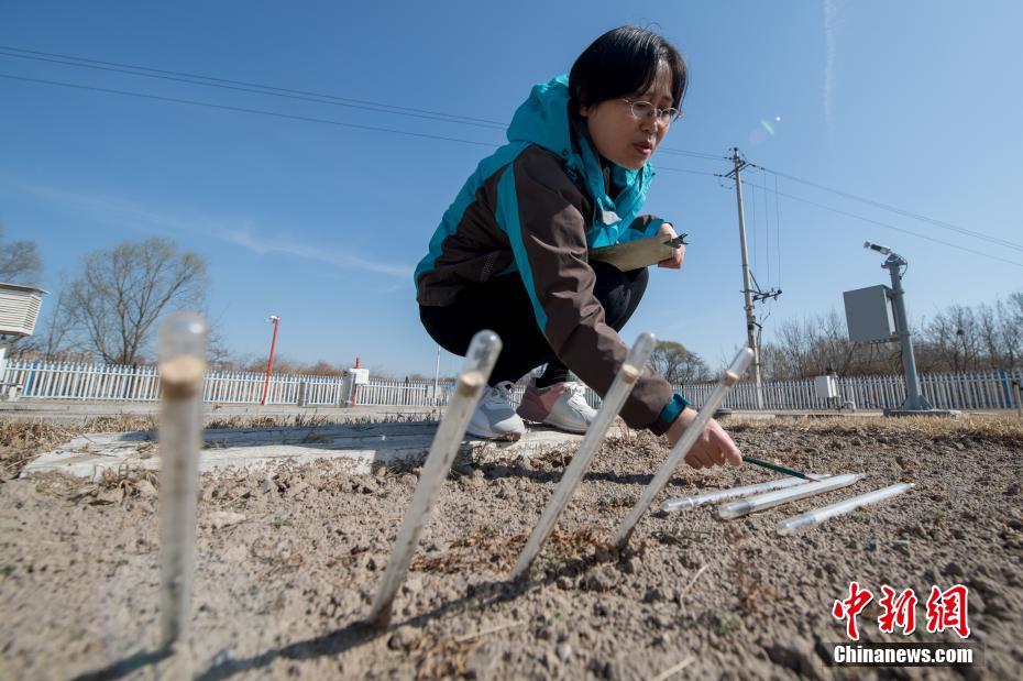在“3.23世界气象日”来临之际,山西省气象局向公众开放,让民众近距离了解天气预报节目的采集制作流程。图为基层气象观测站的工作人员记录着地表的实时温度。中新社记者 韦亮 摄