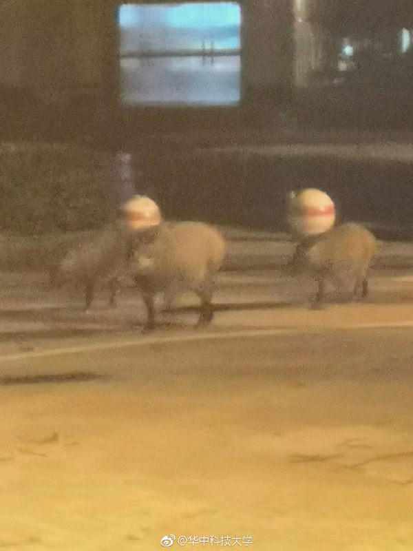 3月22日,华中科技大学官方微博发布消息称,有三只野猪在学校里散步,提醒学生注意安全。照片显示,三只野猪出现在晚上,一大两小,在学校里晃荡。