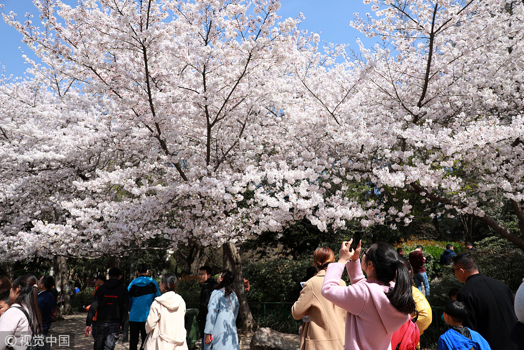 2019年3月23日,河南郑州,阳春三月,万物复苏。人民公园内樱花盛开,花团锦簇、如云似雪美若仙境,吸引众多市民前来观赏。
