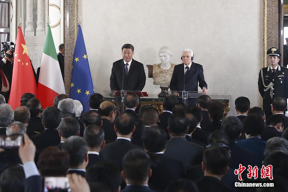 当地时间3月22日,中国国家主席习近平在罗马和意大利总统马塔雷拉一道会见出席中意企业家委员会、中意第三方市场合作论坛、中意文化合作机制会议双方代表。习近平指出,中意两国文化交流精彩纷呈,走在中西文化交流合作的前列。我对中意关系发展前景充满信心。 中新社记者 盛佳鹏 摄