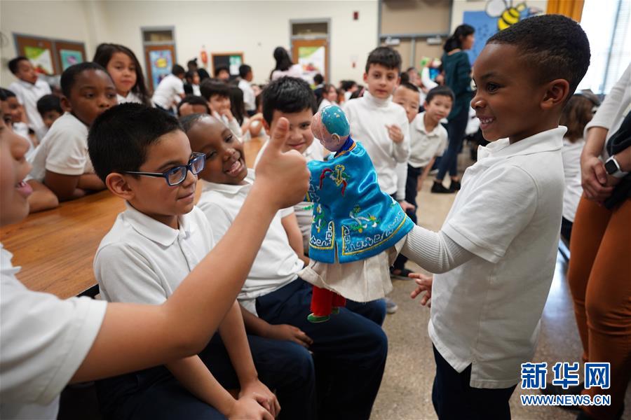 3月20日,在美国马里兰州乔治王子县,潘布兰奇小学的学生们体验木偶戏。近日,福建漳州布袋木偶戏传承人陈黎晖到访了马里兰州7个县多个学校、社区,与3000多名学生、教师、普通民众交流,并入住当地家庭,可谓一次深入美国民间的“草根之旅”。陈黎晖此行一系列活动由当地非营利组织“世界艺术家体验”主办。该组织负责人贝蒂·麦金尼斯告诉记者,布袋木偶戏这种美丽的艺术形式吸引了所有年龄层的人。“孩子们的眼睛会亮起来,笑声不断。成年人也会睁大眼睛,就像孩子一样。”新华社记者 熊茂伶 摄