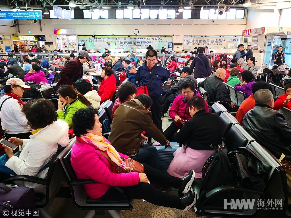 2019年03月22日,韩国仁川港,大批的中国游客满载而归,等待登船回国。