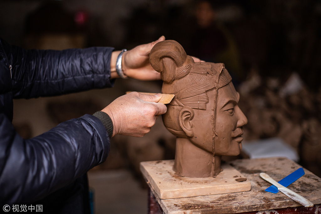 2019年3月23日,西安,曹志卓的爱人,负责给兵马俑五官的细部进行刻划。