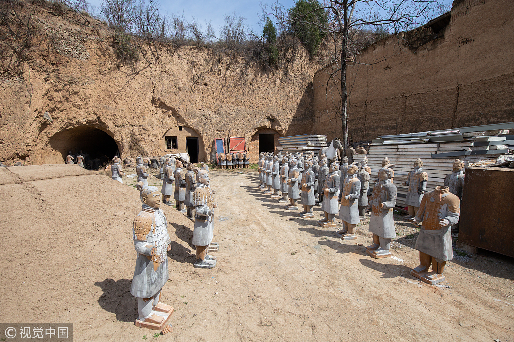 2019年3月23日,西安,陕西兵马俑景区驰名中外,无人不知。去兵马俑景区的游客都会看到许多兵马俑工艺品,这些兵马俑工艺品被游客们带到了全国各地乃至世界各国。然而很少有人知道,这些兵马俑工艺品的生产就在距离景区不足百米的“兵马俑村”。图为已经制作好的放置兵马俑的仓库。