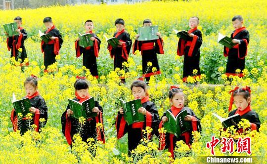 学童在油菜花海中诵读经典国学,呈现出人花相融、天人合一的美丽画图。 卓忠伟 摄