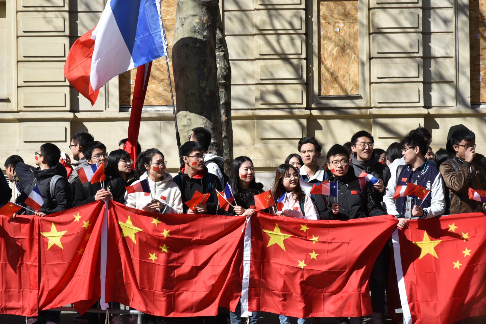 当地时间3月25日,在法留学生在凯旋门附近欢迎习主席。(人民日报海外版记者彭训文 摄)