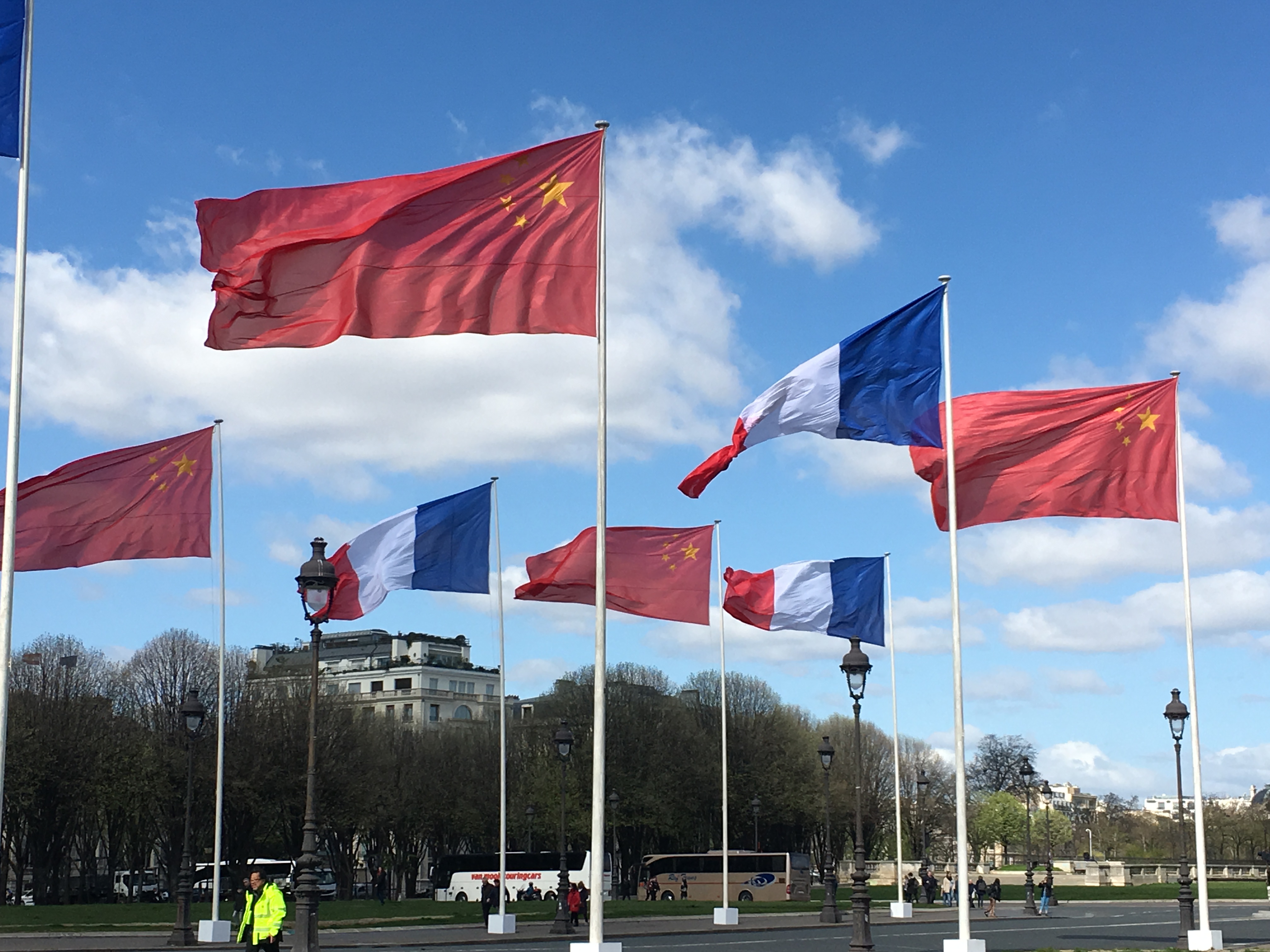 当地时间3月25日,法国巴黎被中法国旗装饰一新。(人民日报海外版记者王海林 摄)