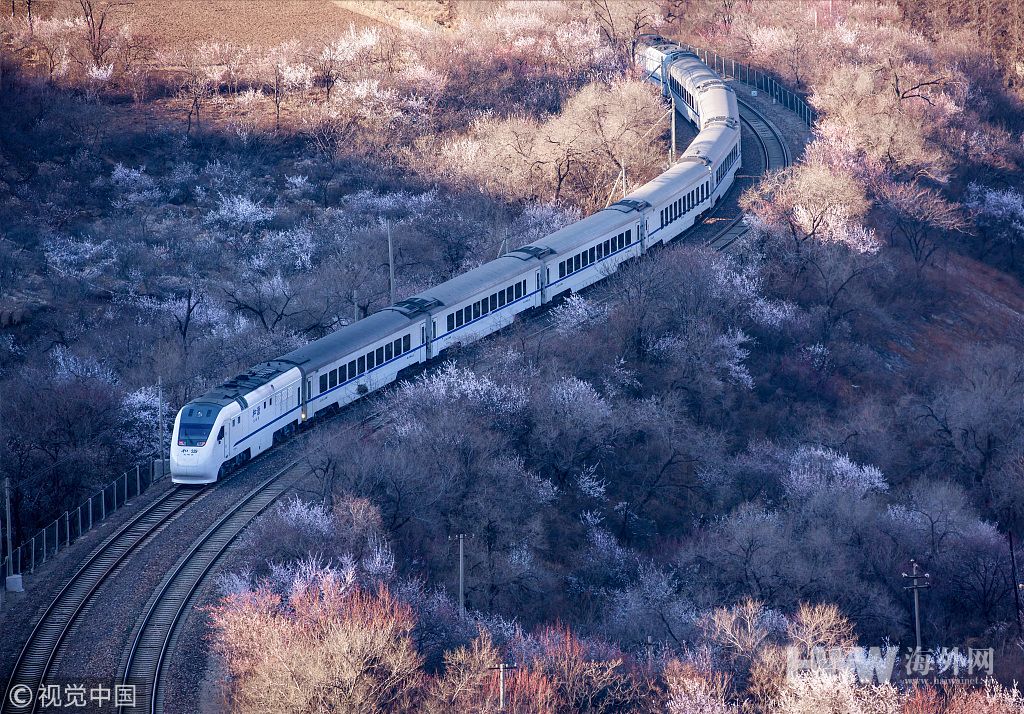 居庸关山桃花盛开 列车穿行其中犹如驶入花海