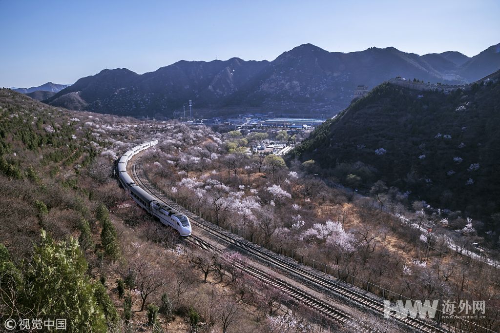 ​2019年3月23日,北京昌平居庸关铁道旁山桃花盛开,列车穿行其中犹如驶入花海。