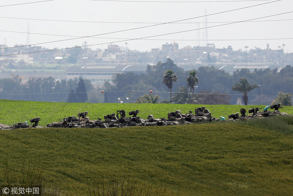 当地时间2019年3月26日,以色列南部与加沙边境,以色列坦克和装甲运兵车在加沙边境附近部署。以色列军队26日继续轰炸加沙地带。巴勒斯坦卫生部当天发表声明说,以军轰炸造成至少10名巴勒斯坦人受伤。