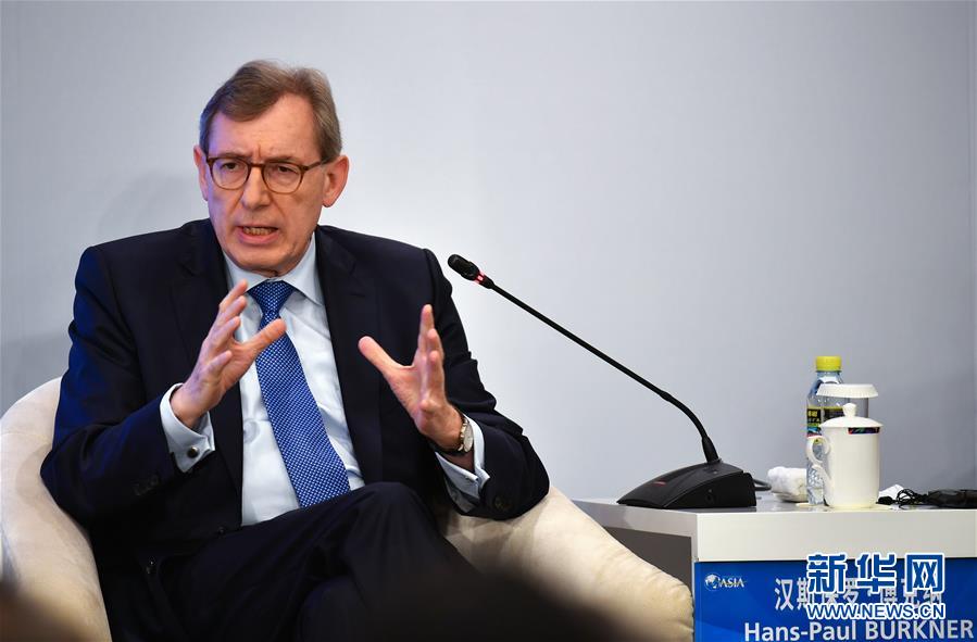 3月26日,波士顿咨询公司董事长汉斯保罗·博克纳在电视论坛上发言。新华社记者郭程摄