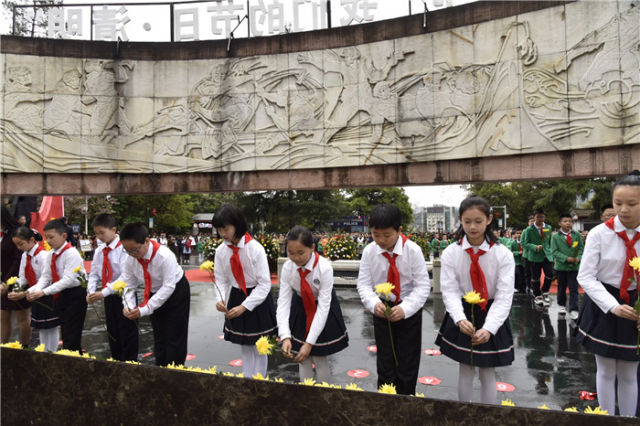 4月4日,学生代表在贵州省遵义市红军烈士陵园献花。新华社发