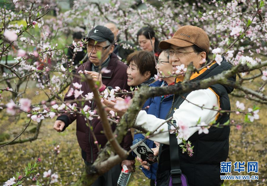 镇上的桃花节开幕,参加抱团养老的老人们前去观赏桃花(3月29日摄)。