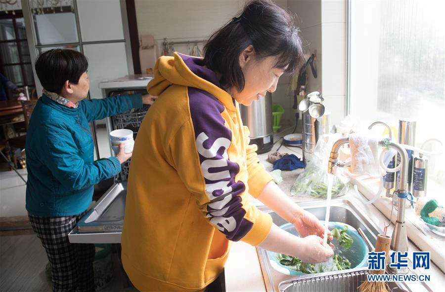 58岁的陈姮(前)和71岁的王荷花在厨房洗碗洗菜(3月29日摄)。