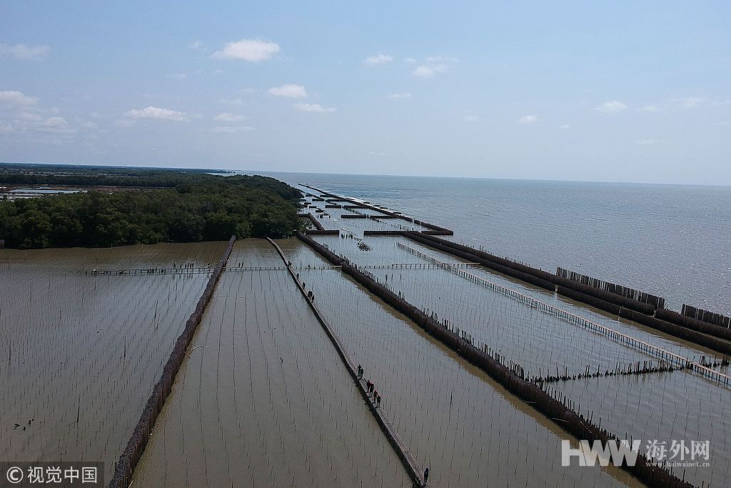 当地时间2019年3月9日,泰国北榄府,航拍Samut Chin村庄的红树林区域和盐塘。