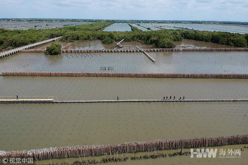 当地时间2019年3月9日,泰国北榄府,航拍Samut Chin村庄的红树林区域和盐塘。