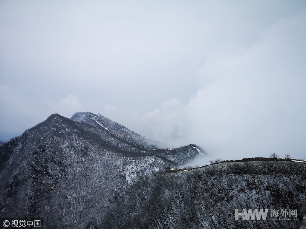 2019年4月9日,北京,箭扣长城飘雪,积雪压枝头。