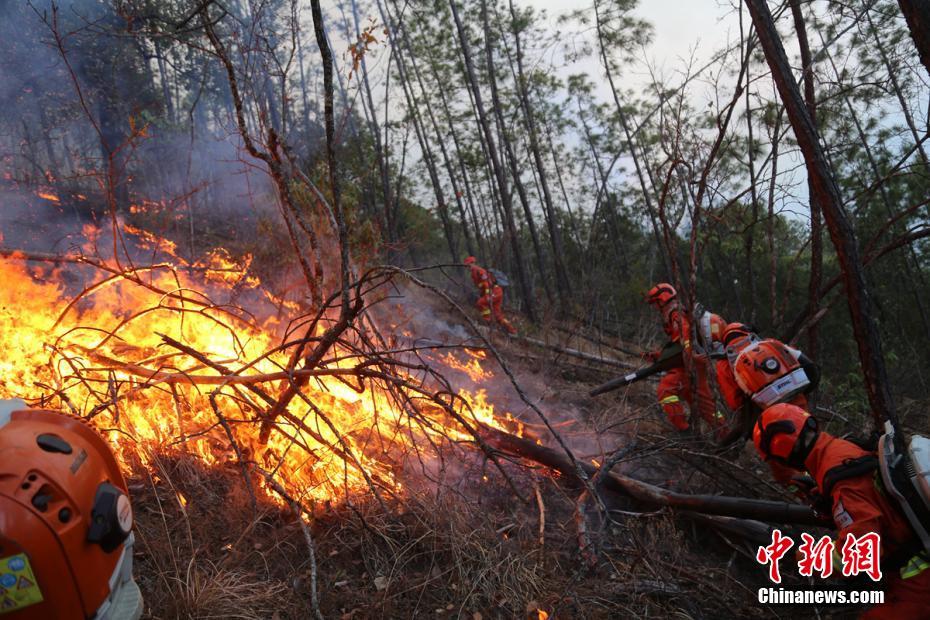 根据火场情况,联指旋即调整兵力部署,命令成都大队一、三中队在火场西线阻截火线烧过盘山简易公路向西发展,凉山德昌、西昌地方专业扑火队100人配属成都大队行动;攀枝花支队在火场拦截明火向东密林方向发展,冕宁县专业扑火队34人、民兵60人配属攀枝花支队行动;成都大队二中队负责火场南线看守清理。图为森林消防队员全力扑救冕宁腊窝乡腊窝村森林火灾。 李丛林 摄