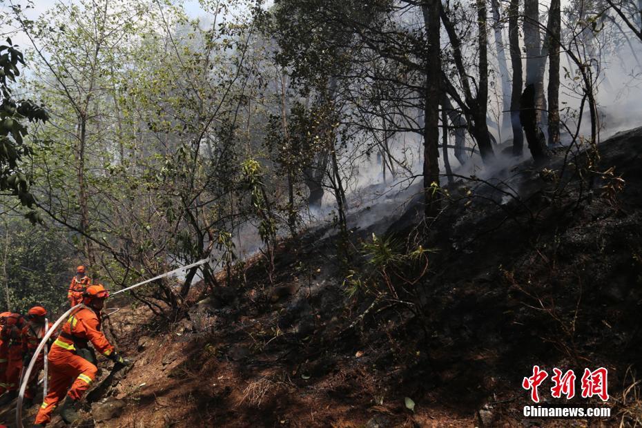 据悉,凉山州已协调增加空中灭火力量和120名专业扑火队赶往火场分线实施地空配合扑救。图为消防队员用水全力清扫火场。丁庚 摄