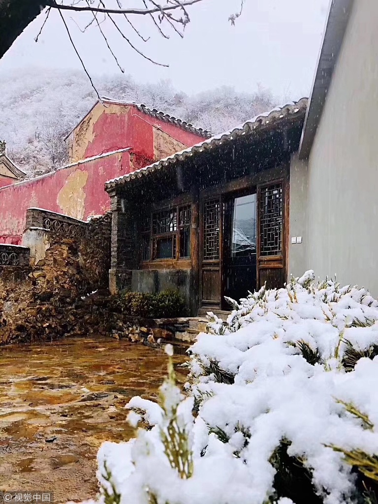 2019年4月9日,白雪覆盖下的百花上景色。当日,京城普降雨雪天,偏远山区更是下起了雪,银装素裹景色迷人。